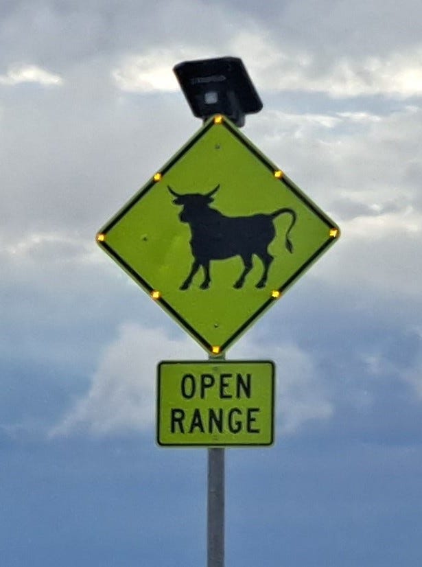 That ominous yellow sign had burned itself into my memory. Below the fearsome bovine image were the words “OPEN RANGE.” Surely it meant something, but what?