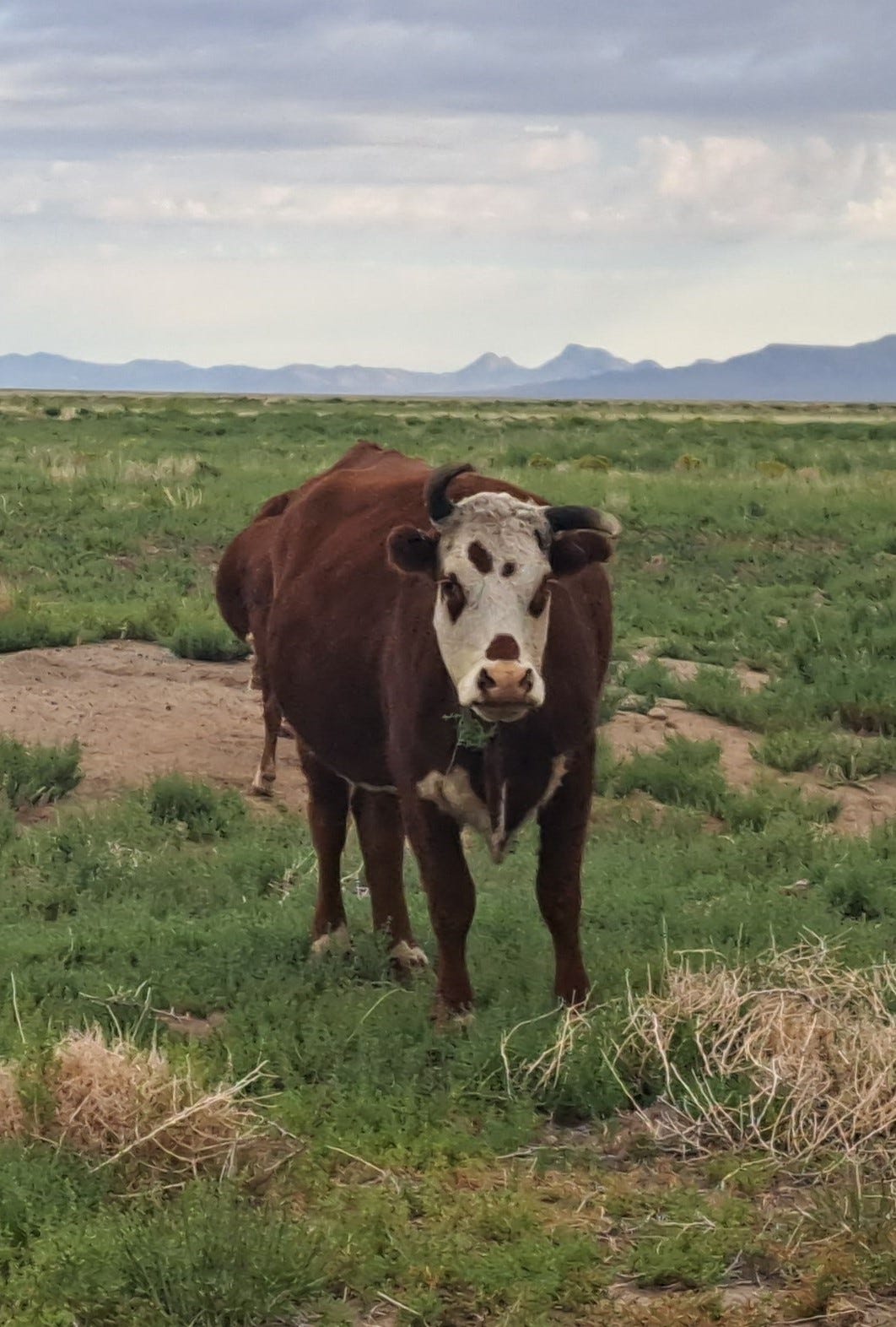 I passed more cows. Real ones again. Then I did a double take. Standing aside the others was one “cow” in particular that demanded my attention. She, I presume she was a she because I’m not sure why, had odd markings. Brown polkadots dotted her long, broad, white-ish face. And her left horn was crooked! Misattached at the lab perhaps? But alien for sure!