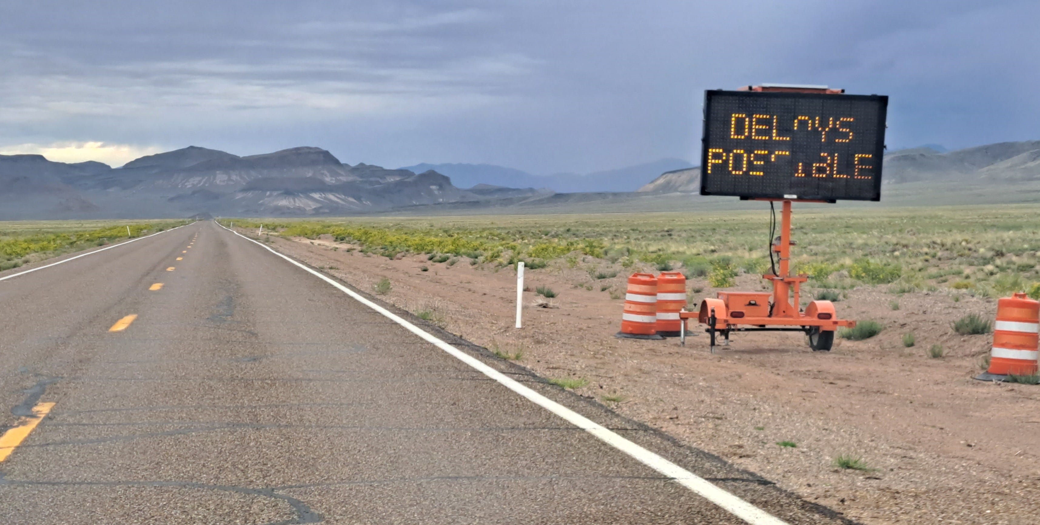 I was feeling quite perplexed now. Had I just seen a real-live alien? How could I know for sure? The answer reached me in a flash. Up ahead, a portable sign had been placed mysteriously along the road shoulder. Out here, in the Middle of Nowhere, as you may recall. It flashed the words, “DELAYS POSSIBLE.” I took it as a direct threat. From the alien cow.