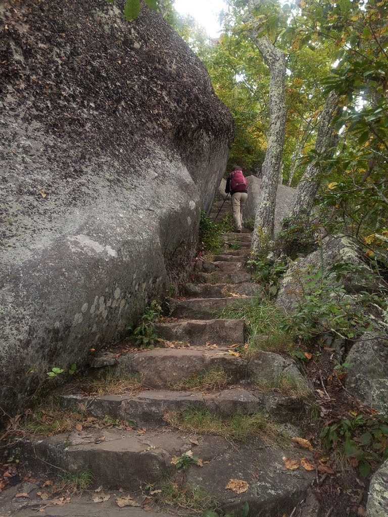 The trail begins at an attractive squared-timber building occupied by a camp store and ascends forest and many stone steps to the rocky summit area 1.5 miles above. Much of the finish is up more stone stairs leading to a high patio and 360-degree views. An old stone “cottage” is nestled in the rocks immediately below, somewhat out of place, but historic and unique nonetheless. We lounged a bit, but once on our feet again we hiked a short loop around the summit area, then headed down to a spur that led over to Buzzards Roost for one last view before calling it a day and motating northward.