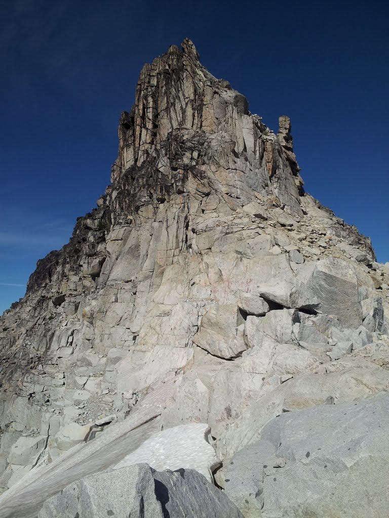 Peter, Kiko and I (Keith smartly opted out) left the burger joint in Leavenworth after dark on August 17 and drove up the Icicle Creek Road to the trailhead. A lumpy flat in the woods would have to do for an unofficial camp. After a lumpy sleep on sticks and roots, we broke away at dawn and had the first four miles and 2,000 feet of gain under our belts by eight-something a.m. We enjoyed a breakfast stop, so to speak, on the rocks at Colchuck Lake, well inside the Alpine Lakes Wilderness. Dragontail Peak, which I also hoped to summit that day, loomed majestically above. Witches Tower remained hidden behind it.