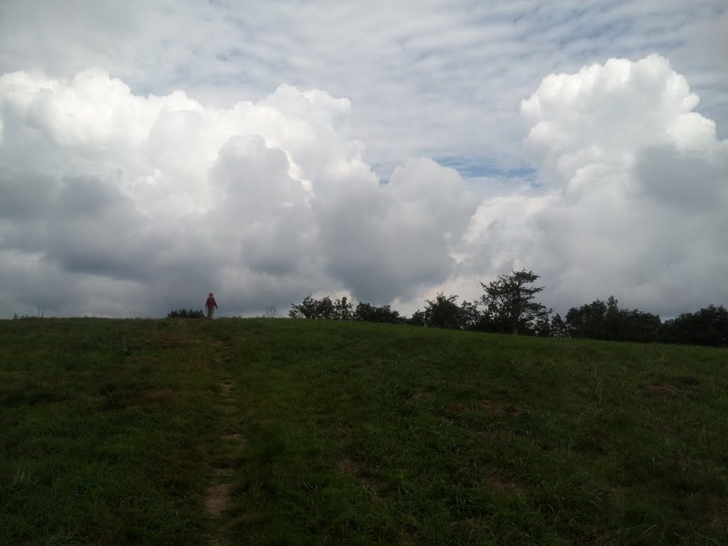 Clouds threatened, so I suggested we reverse the planned 6-mile loop so that we would hit the summit early in case the sky unloaded on us. We followed the AT gently upward in forest and soon entered the first of several grassy meadows, the second being very large with expansive views.