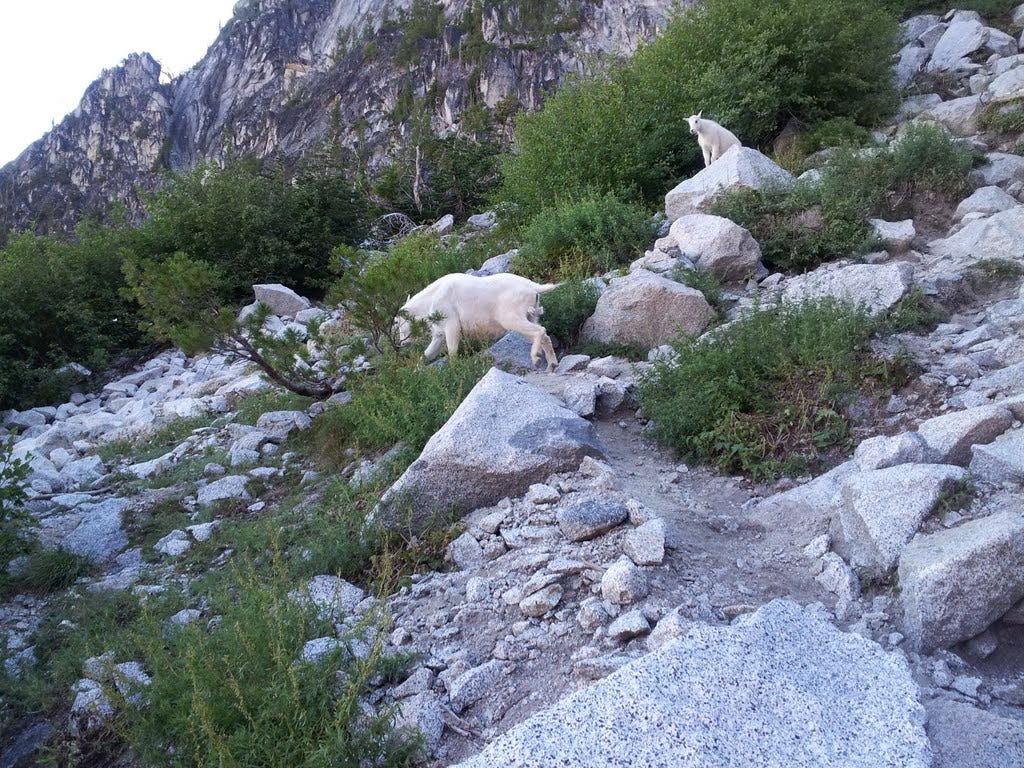 We rambled around the lake and over a boulder field to begin the steep, 2,200-foot infamous trudge to Aasgard Pass. It was a veritable goat trail. As I rounded a bushy bend in the steep and scrabbly path, a nanny and kid mountain goat stood ten yards ahead of me posing for a picture. Cool.