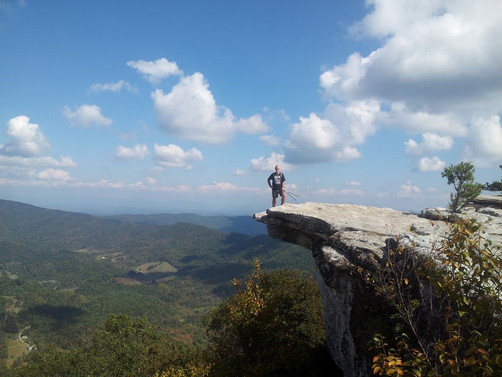 At the summit, one is greeted by an impressive slab of overhanging rock and a perfect view of the Catawba Valley and long ridges of still-green forest extending out to the horizon. A young woman offered to snap a hero shot for me and suggested I sit on the edge of the ledge for a really cool picture. I politely declined. I found a shady spot, devoured a bagel and soaked up the scenery for an hour before finally heading back down. Summit 27 was in the proverbial bag.