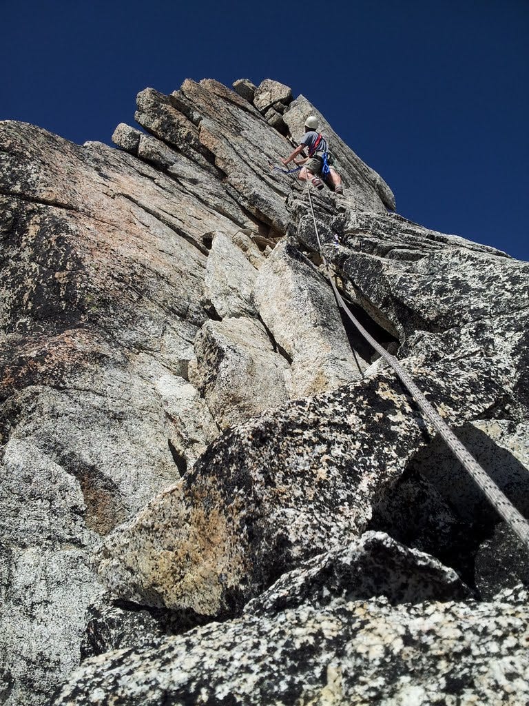 When I returned to the col, Peter had scoped out a more reasonable line of ascent and I quickly agreed to give it a go. He led it all, mostly class 4 with a short class 5 chimney, which was plenty for me, having not even donned a climbing harness or clipped into a spring-loaded cam for at least three summers. And just like that, we scooted up the granite, solid and broken into handholds and footholds in all the right places. I pushed through the chimney, around a corner and up a little friction face and there was the summit.