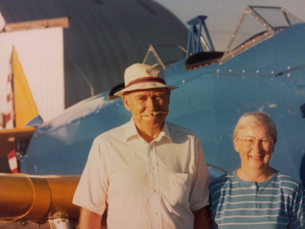 My sister picked up sandwiches and cookies on her way down from Phoenix. My brother flew out from Philly and grabbed the ice and beverages, while I arranged with Ponderosa Aviation at the Safford airport to hold the event in one of their spanking new hangars. We set up the tables and chairs and I picked up some flowers at a local shop for the occasion. I had also enlarged some pictures of Don (my dad) and Clarice and brought along my dad’s photo albums and log books from his sailboat and airplane days to share.