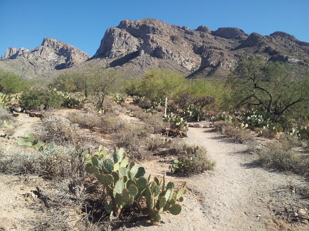 I hit the trail at 2:00 pm and meandered among the prickly pear and creosote into the saguaro zone, with the rocky summit looming dead ahead. As warned, the climb was steep, but the trail was in better shape than I had imagined from the descriptions online. It was just a matter of upward trekking as the valley beneath me slowly fell away from one turn to the next. I saw no one else on the mountain, though Pusch is surely a popular weekend hike.