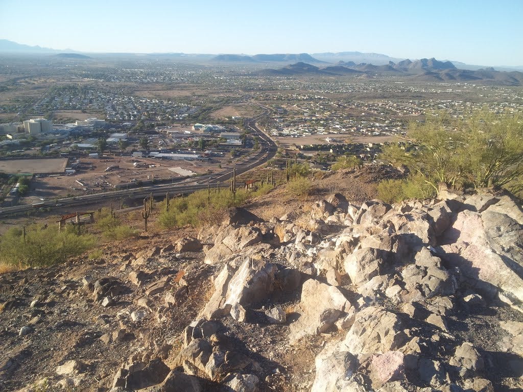 Above my motel room in Tucson rose tiny Sentinel Peak, also known as A Mountain, due to the giant white “A” plastered across its face (one of those college things). Coming into town after my dad’s memorial, I thought I might have just enough time to run up the peak before dark and thereby add one more baby summit to my list. After driving around in figure-8s lost for a while, I found the correct sideroad leading up the hill. But police had the road blocked and shooed me away.