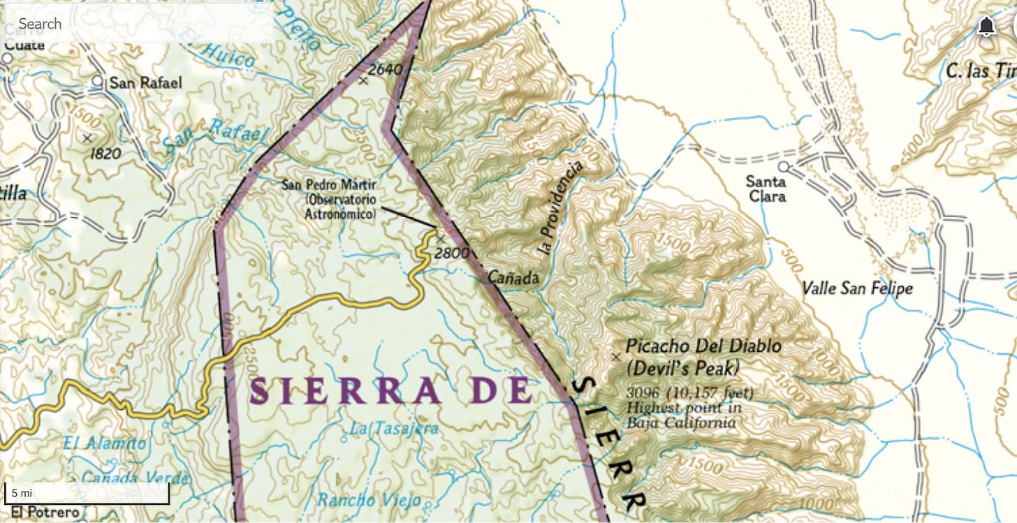 Most canyons, according to the topographical maps I carried, poured off to the east, as any good canyon should in a north-south trending mountain range. The Canyon of the Devil, as noted, had ulterior motives, flowing south to north, parallel to the escarpment, which also left it largely hidden from view. Descending fifteen miles from the high col between Picacho del Diablo and Botella Azul, Cañon del Diablo necessarily cut a deep trough between dramatic granite walls.