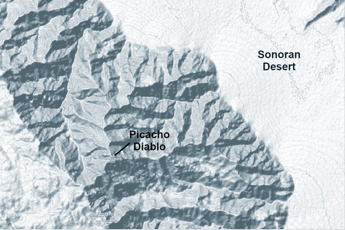 Our bus rolled through the desert offering a glimpse of the abrupt escarpment of the San Pedro Mártir, a formidable looking barrier we’d need to cross. We presumed a higher bump on the distant skyline was the darkening silhouette of our stony objective, Picacho del Diablo.