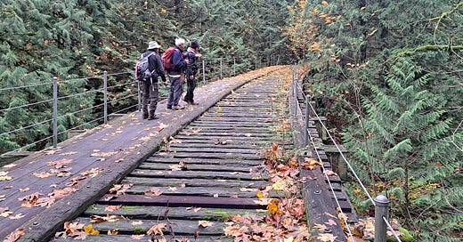Note that the trail is on private property belonging to a church retreat off Highway 9 south of Sumas. Access requires checking in with the folks there before traipsing off into the woods. The well maintained trail network spans several miles, including a stretch along an old railroad grade above Saar Creek. Old trestles add interest to that part of the walk. Though they are slowly fading into history, they are also hefty. So with enough care, maybe they’ll last a few more decades.