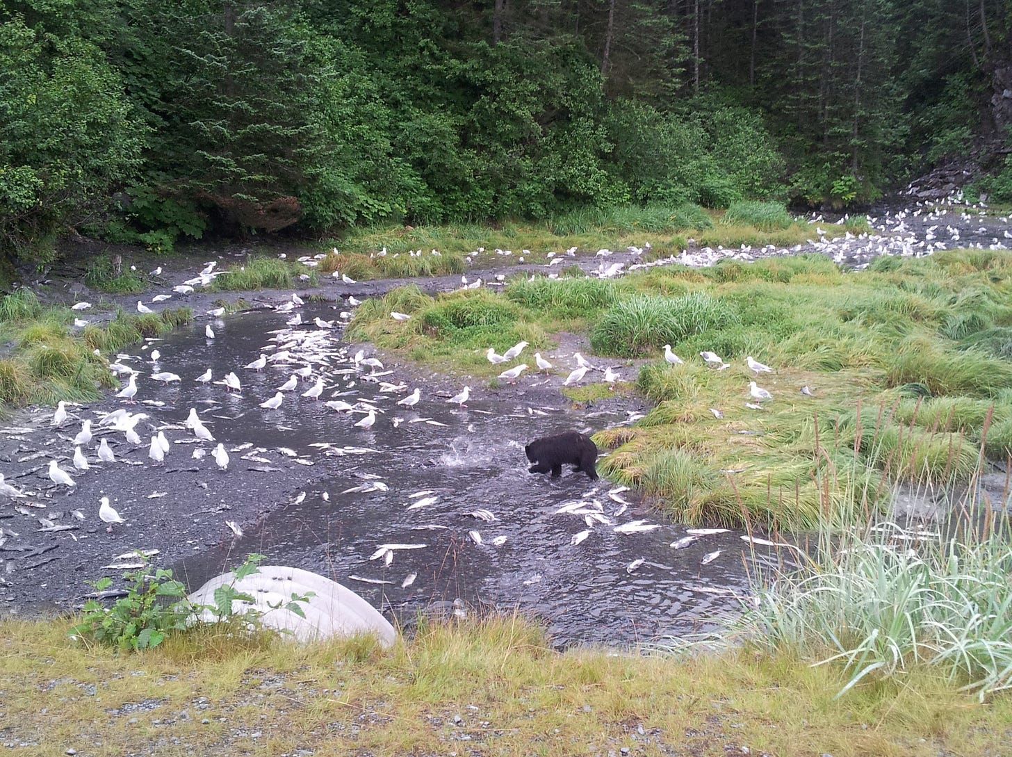 I’d passed the Solomon Gulch Fish Hatchery along the way and learned that coho salmon were returning from sea by the tens of thousands. You could watch them gathering en masse near the hatchery. Hundreds of millions of coho and pink salmon eggs are incubated here annually, then released as fry and smolt, making Solomon the largest such producer in North America (impacts on wild salmon are still debated). Thousands of seagulls were there for the show as well. Many of them would fly low to the water, against the current, then raft back down pecking and nibbling on those poor, heroic salmon. Even a sea otter drifted past feeding on a fish.