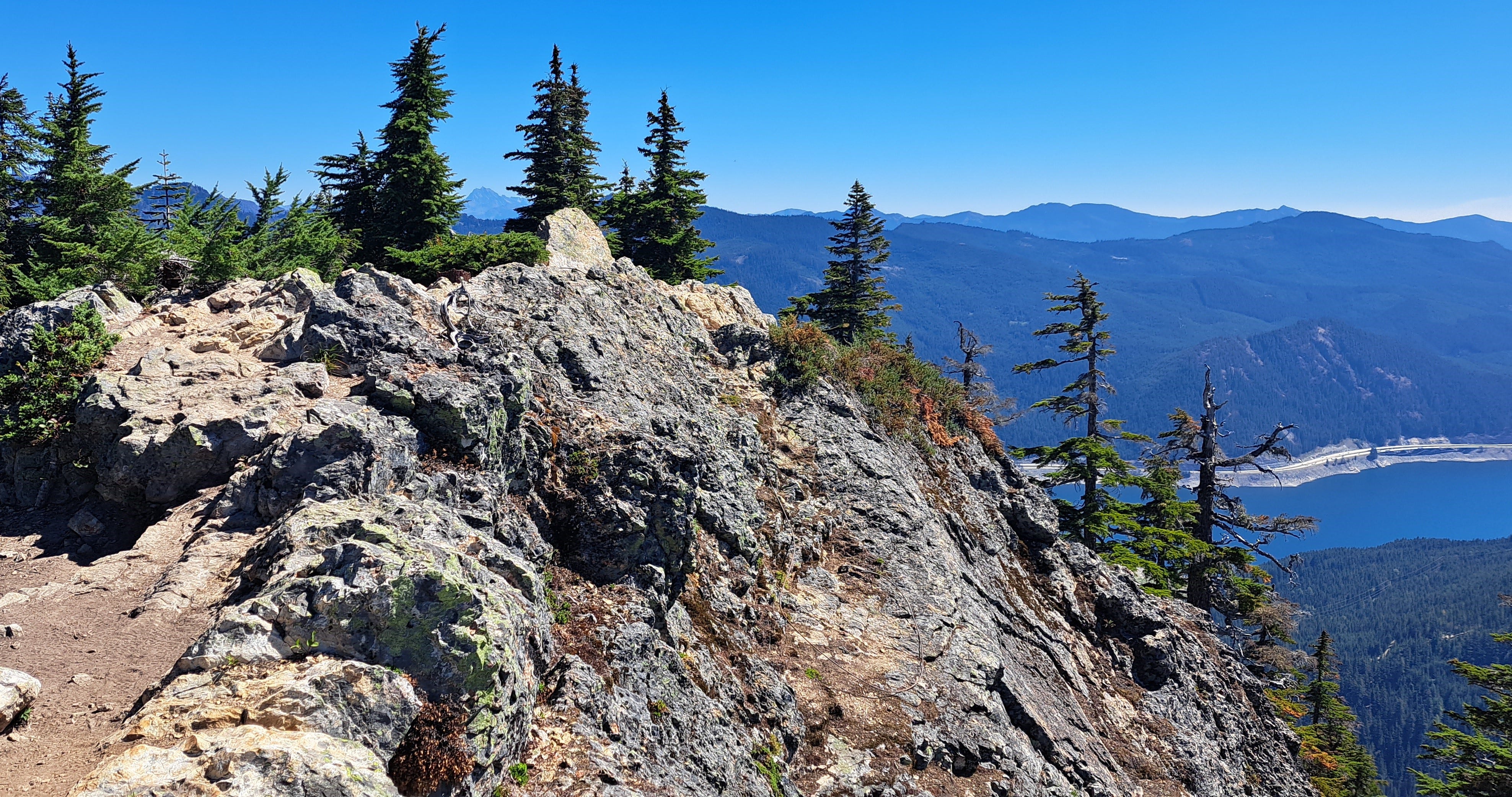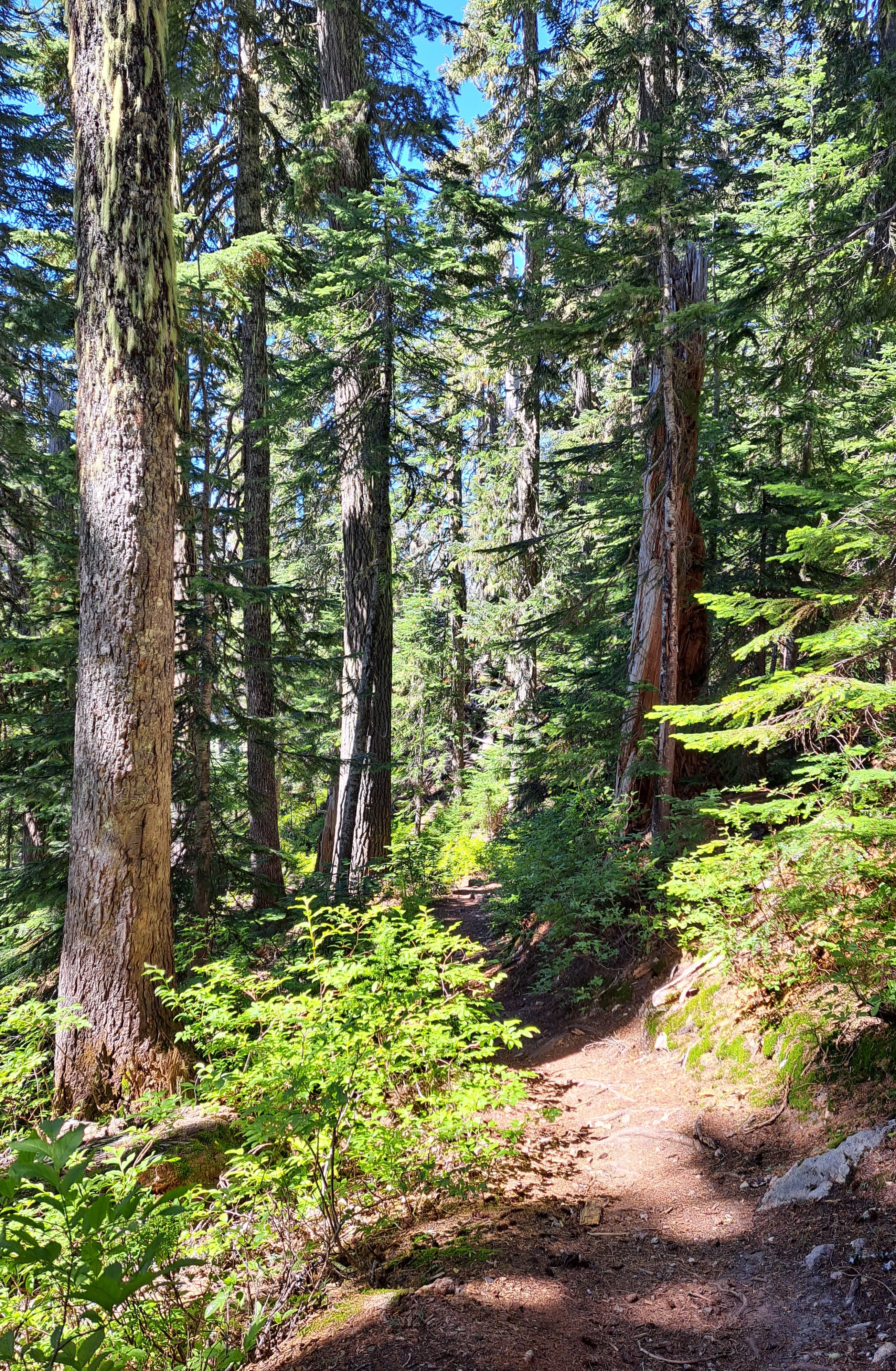 I'd planned a good scramble off I-90 for the day (Alta Mountain), but woke up in my tent feeling funky. So I went for something much easier, Mount Catherine, which sees much less use. The temp was already above 80 F. when I parked, with just one party ahead of me, which turned out to be a young guy and his dog returning from their hike minutes later.
