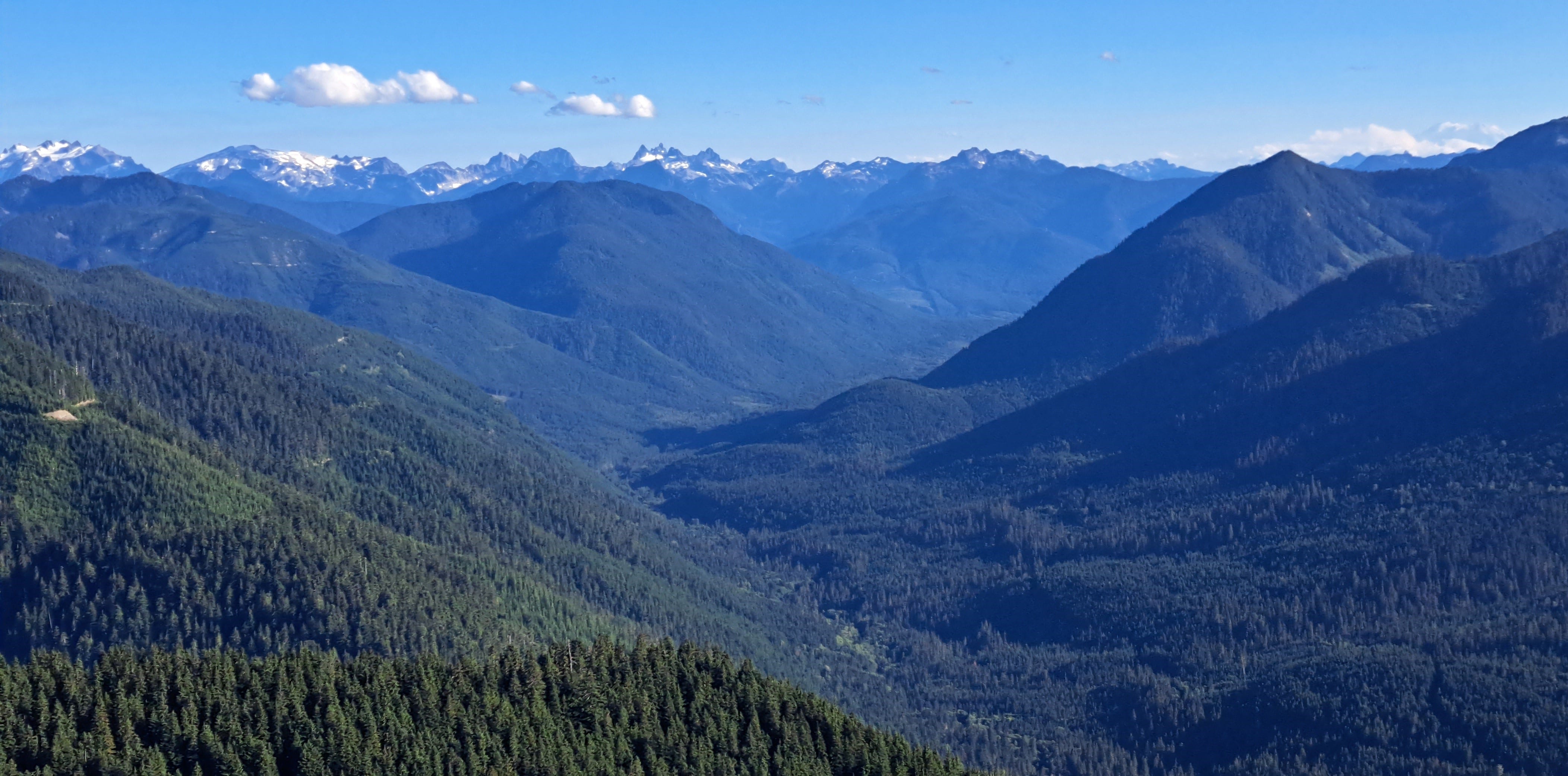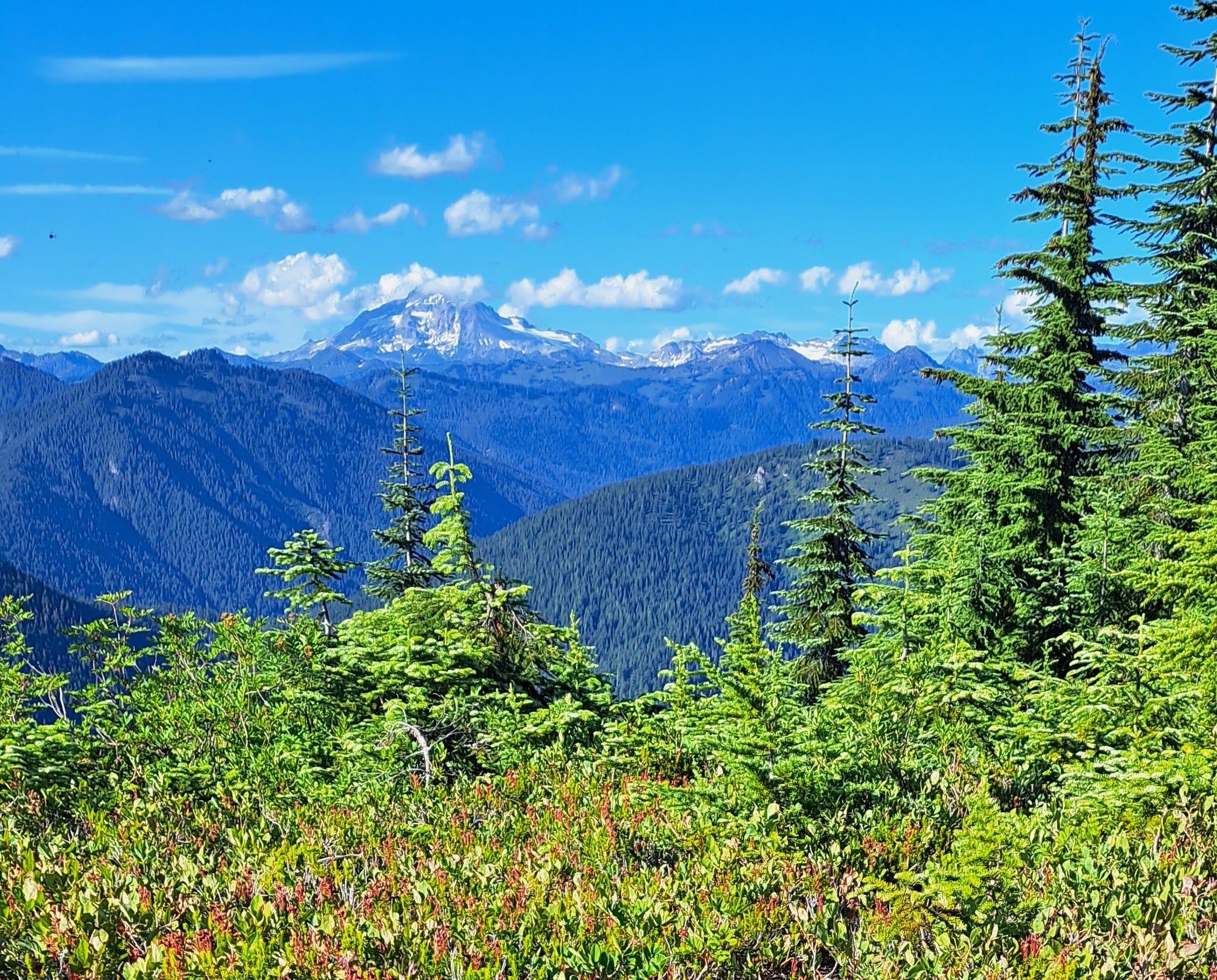 Looking south, the prominent peaks of the Alpine Lakes Wilderness were, well, prominent. And to the right of conspicuous Chimney Rock, the top of Rainier poked above a cloud. Below, a long, steep meadow of ferns and fireweed plunged into the seemingly lush valley of the Beckler River, though it was heavily logged over the years, and then partly burned last year during the Bolt Creek Fire. Across the way, I could just barely pick out the lookout on Evergreen Mountain.