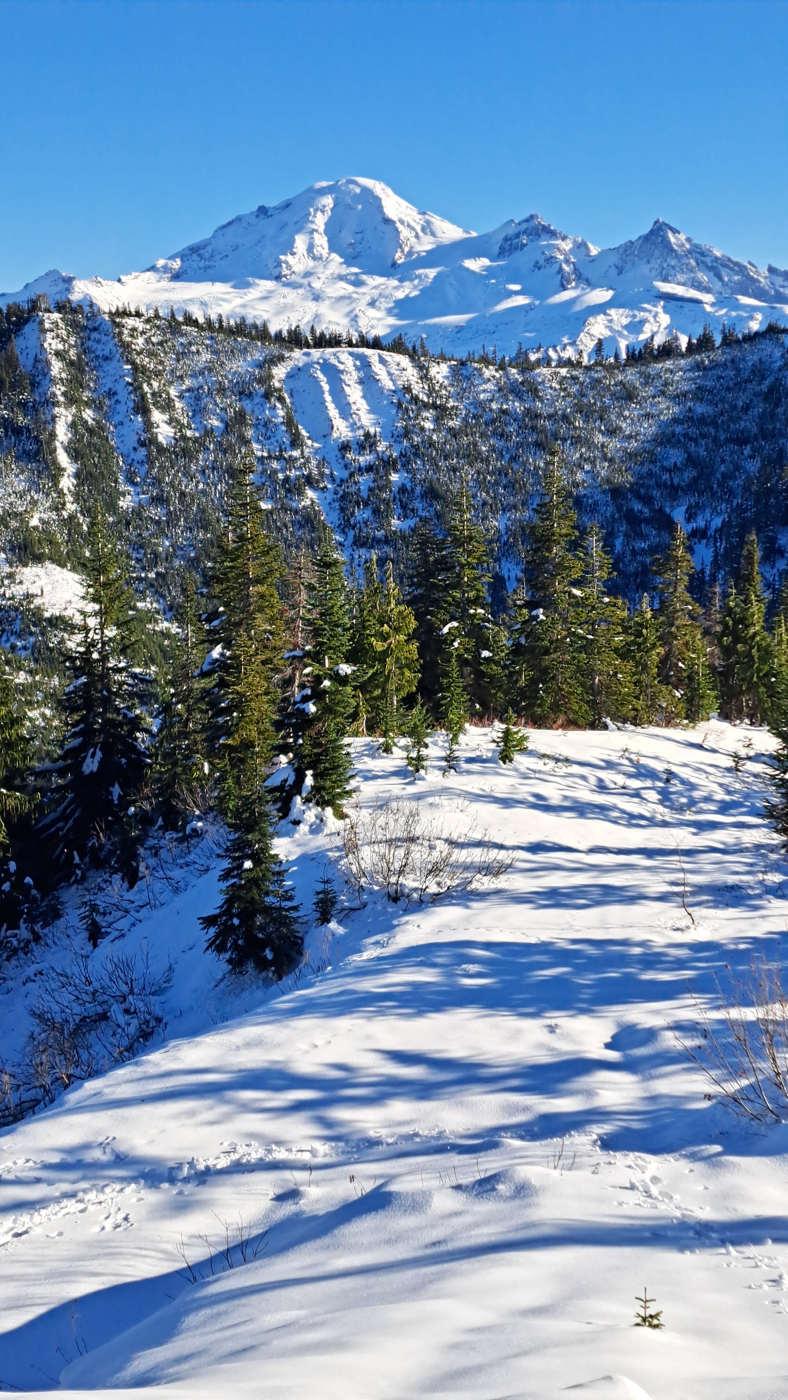 With a bit of pruning, the overgrown road would make a fine ski or snowshoe hike in the shoulder seasons. One spot near 4,600 feet could be a little iffy in avalanche conditions, but most of the way is along easy grades with frequent views of familiar peaks, from Church Mountain to the northeast and the Twin Sisters to the south, as well as the B.C. Coast Range and a sliver of Bellingham Bay. We also saw a lot of fresh tracks in the snow, apparently including snowshoe hare, coyote or fox, and bobcat, though I’m no expert.